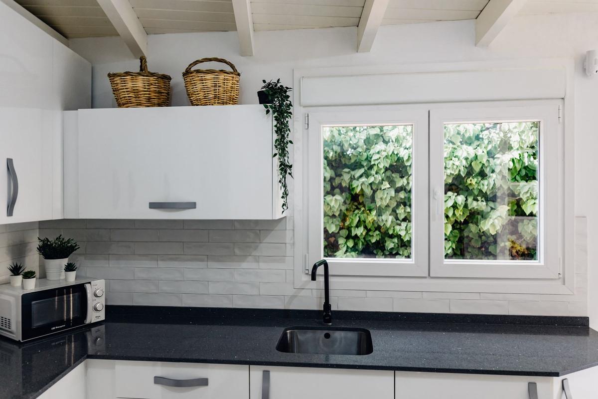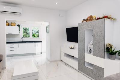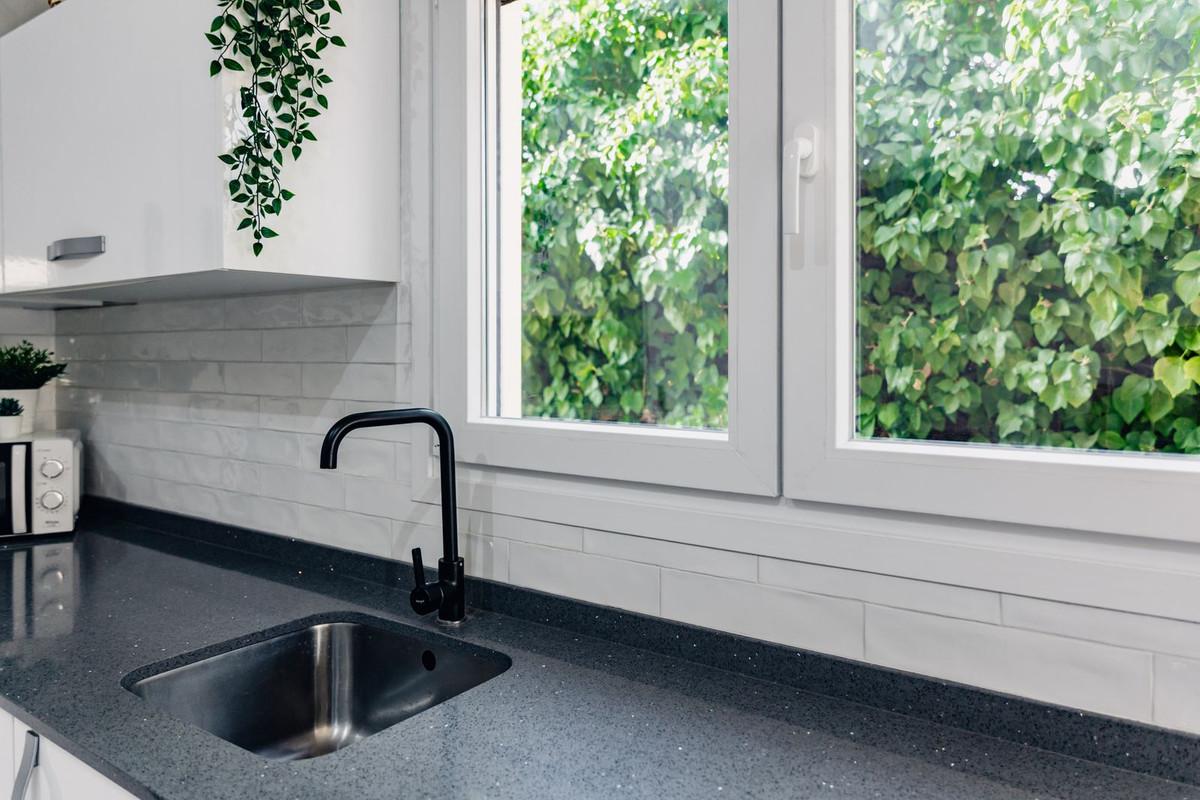The bathroom, also fully renovated, boasts high-quality finishes with marble details that add an elegant and contemporary touch.