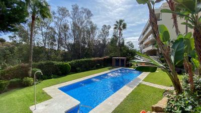 Located within the heart of the beautiful urbanisation of Calahonda, this spacious and bright elevated ground floor apartment comprises of a hallway, lounge/dining room with patio doors leading to a very spacious terrace, fully fitted kitchen with seperate utility/laundry/pantry, one double bedroom with ensuite bathroom, a further double bedroom and family bathroom. In addition, a third bedroom/office/children´s play room has been added by extending onto the terrace. Accessed via stairs or lift, the property has an underground carparking space and storeroom.
