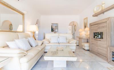 From the entrance, comprising of AndalucÃan style enclosed courtyard with storage and integrated utilities, entrance door leading into the hallway accessing a fully renovated luxury white Mayfair style panelled kitchen equipped with integrated appliances, luxury grey granite surfaces with open hatch window accentuating the beautiful views. Impressive open plan lounge / dining room styled with elite travertine marble furniture, 2 light cream leather matching sofas, light oak wall units and high specification wall to wall picture windows offering exquisite views and access to the exterior dining and relaxation terrace with an extensive garden situated in front of the terrace. The Master bedroom is furnished with an impressive luxury lacquered furniture suite with adjoining spacious beautifully renovated master bathroom.