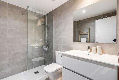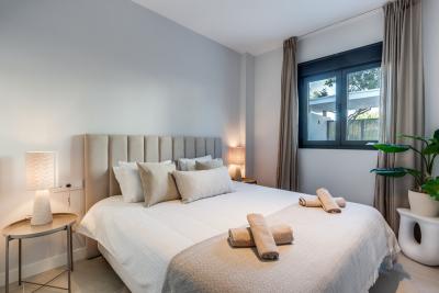 The apartment features two beautifully designed bedrooms, including a serene master suite with its own en-suite bathroom, along with a second contemporary bathroom. The bright open-plan living area flows seamlessly onto a spacious 40m² terrace and an 80m² private garden, creating an outstanding 120m² of outdoor living space perfect for relaxing, entertaining, and enjoying the Mediterranean climate. A modern, fully equipped kitchen completes the interior, offering both functionality and elegant design.