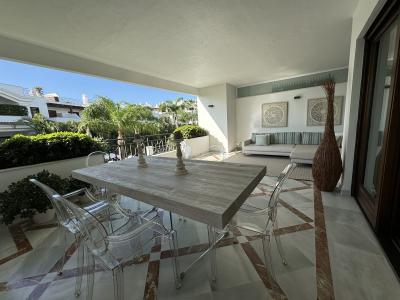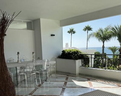 An elegant 2-bedroom, 2-bathroom apartment for sale in the prestigious beachfront development of Doncella Beach, ideally located on the first line of the sea in Estepona.