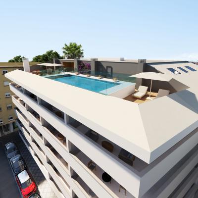 It is a modern building with 1, 2, and 3-bedroom apartments, featuring a rooftop pool and chill-out area. All apartments include a parking space in the price and come equipped with a fully fitted kitchen with appliances, air conditioning and heating, shower and bathtub screens, and a bathroom vanity unit with mirror in the main bathroom.