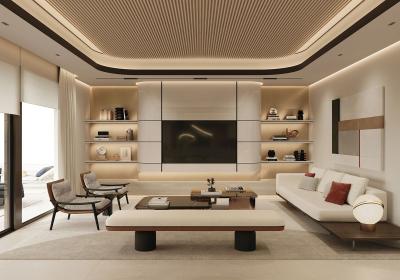 Premium lighting package â black 2700K LED spotlights in the living room, bedrooms and kitchen; recessed ceiling lights; LED strips along skirtings; and ambient lighting in bathroom niches.