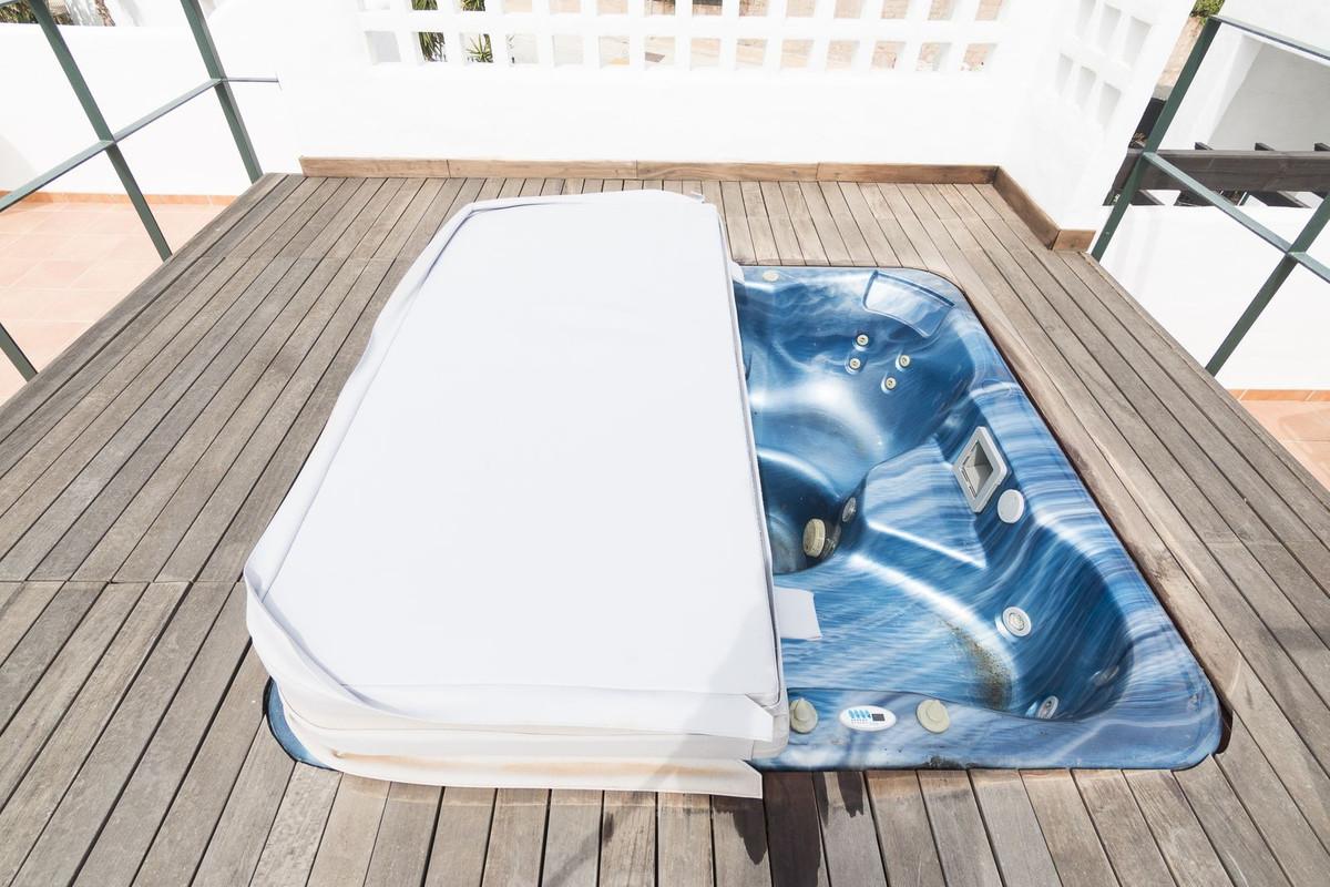 Located in a charming residential complex composed of 8 small three-story blocks, this exceptional penthouse offers a spacious living room, a fully fitted kitchen with a separate utility room, 3 bedrooms including a master suite with en-suite bathroom... Within a pleasant residential complex where the apartments are distributed across 8 small blocks of three levels, this penthouse offers a spacious living room, a fully fitted kitchen with separate utility room, 3 bedrooms (one en-suite with its own bathroom and access to the terrace), a second full bathroom, and a beautiful large terrace of 47m² leading up to a 128m² solarium with pergola and jacuzzi, boasting breathtaking views of the golf course, the mountains, and the sea.