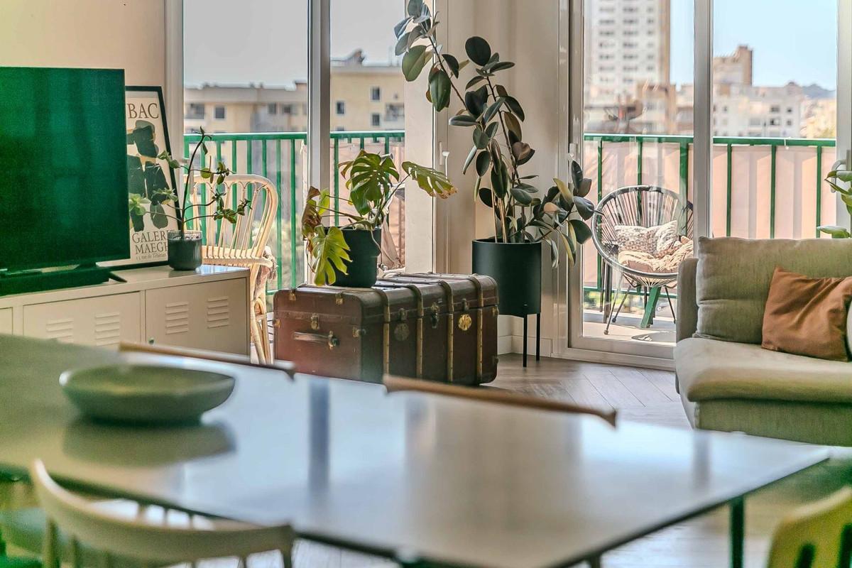 The property offers three double bedrooms, two modern bathrooms and a living-dining room with an integrated kitchen that opens up to natural light. The third bedroom, which is glazed and connected to the living area, is ideal as an office or guest room, adding versatility to the space. It also has a practical laundry room hidden behind wooden slats, maintaining the order and aesthetics of the flat. Every detail of the flat has been designed to offer comfort and contemporary style, with elegant finishes and a functional layout.