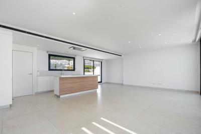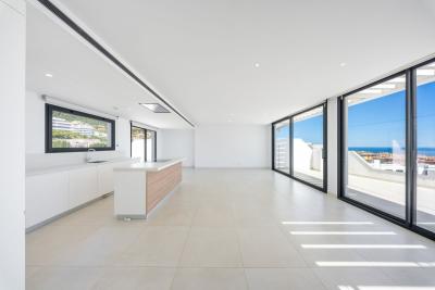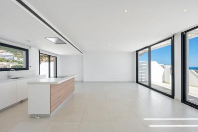 Spanning 142 m² of beautifully designed interior space, the home blends elegance with modern comfort. The open-plan kitchen is fully fitted with premium BOSCH appliances, seamlessly connecting to a bright and spacious living-dining area. From here, step out onto the spectacular 142 m² wraparound terraceâperfect for entertaining or relaxing while soaking in the tranquil surroundings. The terrace's distinctive curved architecture and glass frontage maximize natural light and enhance the breathtaking sea views from both the living room and master suite.