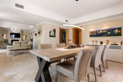 The living area exudes elegance and tranquility, with a separate dining room that is bathed in natural light and opens onto a spacious terrace. The distinct lounge area is equally impressive, featuring high ceilings, contemporary lighting, a cozy fireplace, and a welcoming, relaxed ambiance. Large sliding doors create a seamless connection between the indoor and outdoor spaces, framing breathtaking views of the Mediterranean Sea and the Los Flamingos golf course.