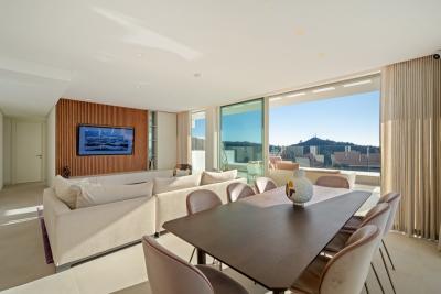 The property features a spacious open-plan living and dining area with a designer kitchen fitted with Gaggenau appliances, seamlessly connecting to expansive terraces through floor-to-ceiling glass doors. Multiple terrace spaces throughout the home create a strong indoorâoutdoor flow and offer complete privacy with open sea and mountain views.