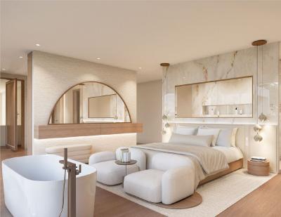 The master suite feels like a five-star sanctuary, featuring a freestanding bathtub by the window, private spa, designer dressing room and a terrace overlooking the mountains.