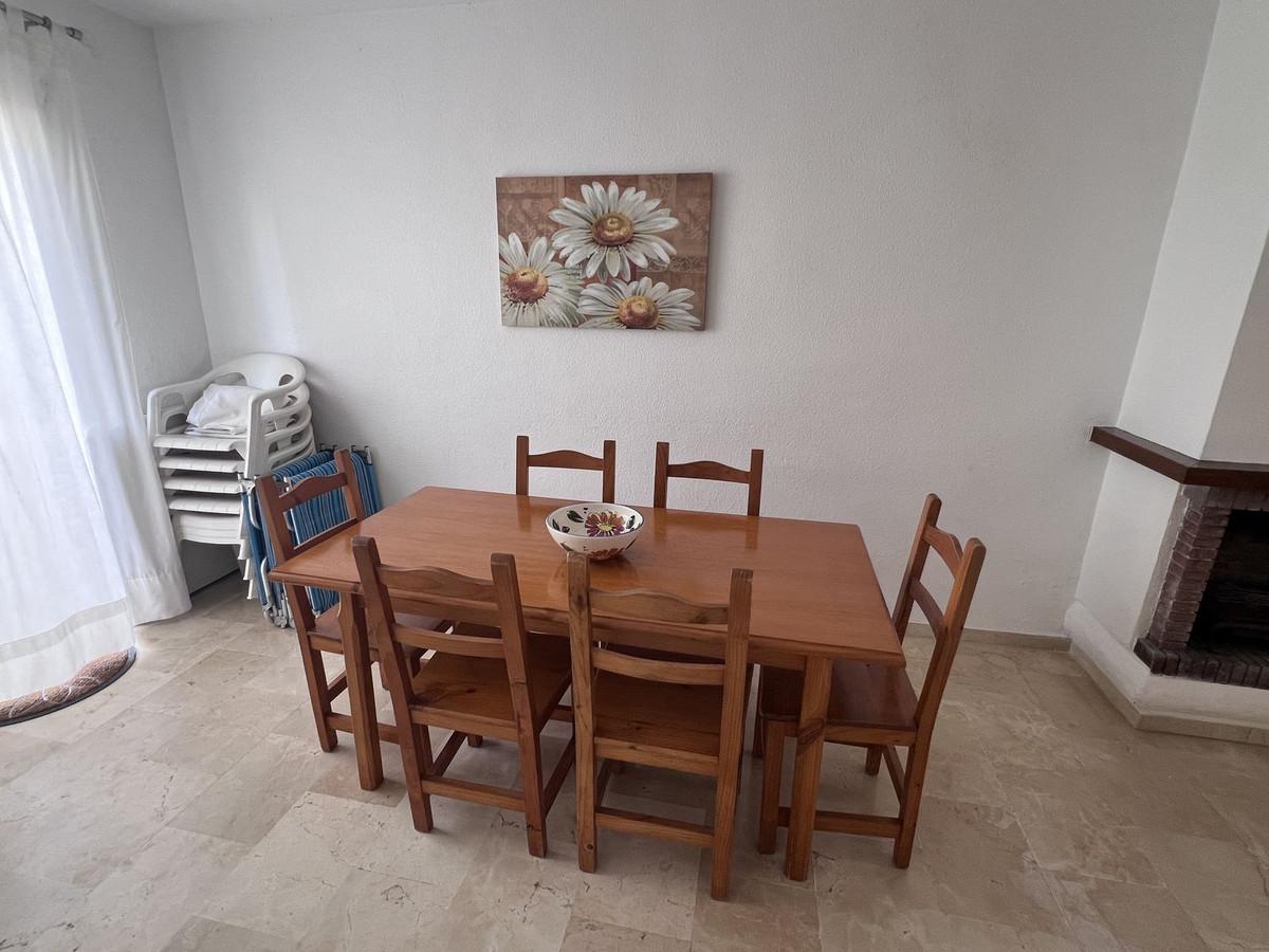 From the dining area, patio doors lead out to a private west-facing patio garden, ideal for enjoying the afternoon and evening sun. To the front, a smaller east-facing terrace provides a lovely spot to relax in the morning sunshine while taking in views of the community gardens, pool area, and La Concha mountain beyond.