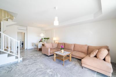 The entrance floor consists of a functional kitchen, a guest toilet, and a large storage room for household items. The separate kitchen can be converted into an open-plan space if desired. There is also a spacious living room with a fireplace and a large balcony overlooking the Mediterranean Sea.
