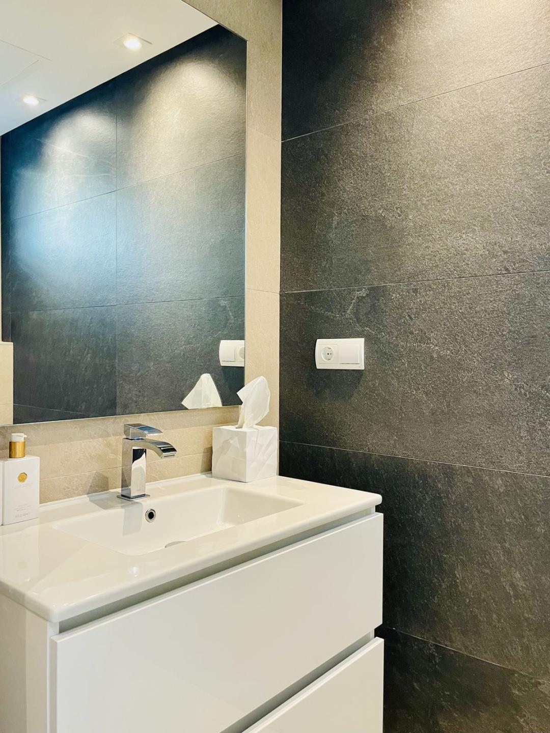 On the upper floor, three bedrooms and two modern shower bathrooms are available. The bright master bedroom features a separate dressing area with direct access to the bathroom with window. High-quality mirrored cabinets in the bathrooms, elegant stair handrails, and fly screens installed on all windows throughout the house underline the high standard of finishes.