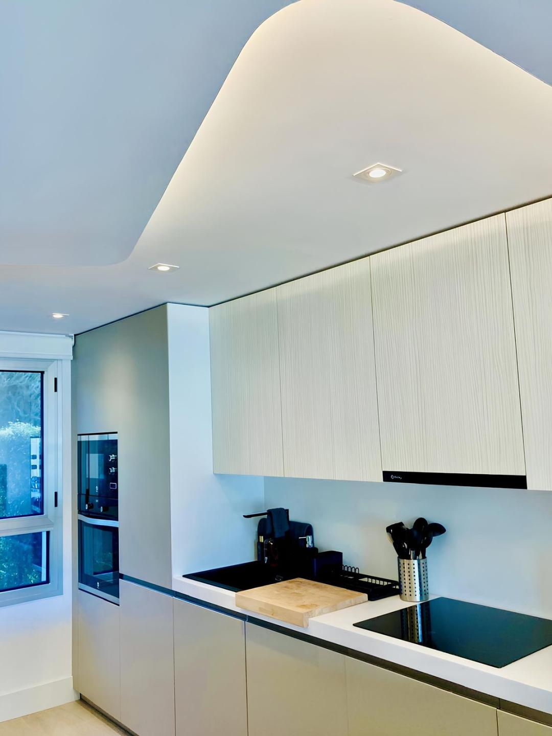 The main living level offers a modern open-plan, fully equipped kitchen with breakfast bar, an integrated dining area, and a light-filled living room with direct access to the private garden terrace. A guest toilet is also conveniently located on this level.