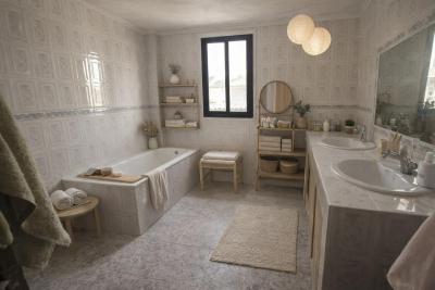 Large bathroom with bathtub and double sink