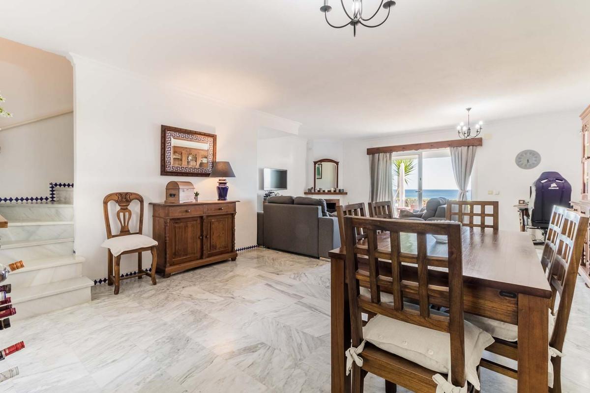 Upon entering the property, you will find a convenient guest toilet. You are then welcomed into a spacious and bright living-dining area with a fireplace and a... Beautiful beachfront townhouse in Manilva Costa, located in an exclusive seaside development.