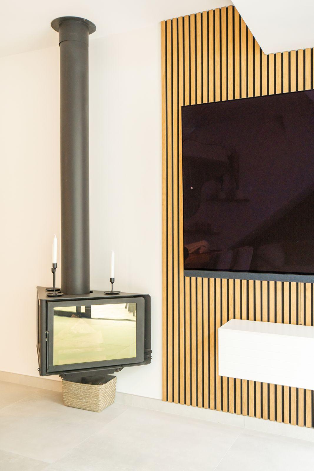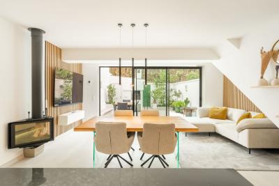 The main floor features an open-plan living and dining area, a stylish white kitchen, and a statement iron-and-glass fireplace. Large glass doors open onto a sunny private patio â ideal for dining or relaxing outdoors. An adjacent outbuilding houses a laundry area, toilet and shower, designed for both functionality and style.