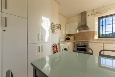 The apartment features a large open-plan living and dining area, enhanced by elegant marble floors throughout and a charming fireplace, creating a warm and inviting atmosphere all year round. Large doors connect the living area directly to a generous private terrace, perfectly oriented to the south and ideal for outdoor dining, sunbathing, or simply enjoying the open sea views and Mediterranean climate.