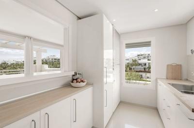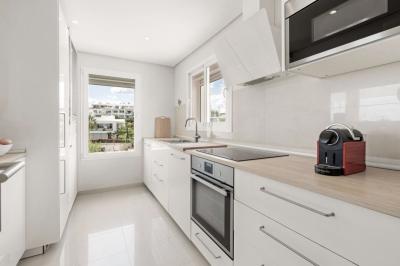 The apartment enjoys a desirable south orientation with open views over the gardens, the pool, and the Mediterranean. It features two terraces: the main south-facing one overlooking the communal areas and sea, and a secondary north-facing terrace with pleasant mountain views. Indoors, high ceilings and natural light define the home's comfortable layout. The living room opens onto the main terrace, while the contemporary, fully equipped kitchen sits just behind it, joined by a convenient serving window.