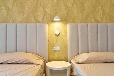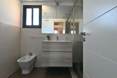 The generously sized living room is perfect for year-round living and opens directly onto a pleasant covered terrace. The property offers two double bedrooms with ample wardrobes and centralized air conditioning throughout. The master bedroom has access to the terrace and includes an en-suite bathroom with double sink and bathtub, while the second bathroom, independent, features a shower.