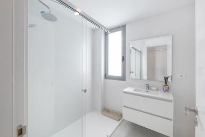 The apartment features a modern open-plan layout with a spacious living room that leads to a private terrace overlooking the garden. The interior is designed with natural light in mind, featuring large windows and neutral finishes that enhance the sense of space. The kitchen is fully equipped with quality appliances and integrated into the living area for a seamless flow. Two comfortable bedrooms and two bathrooms, including one en-suite, make the apartment suitable for permanent living or as a holiday residence.