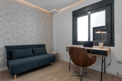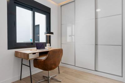 The property offers two bedrooms and two bathrooms. The spacious master bedroom includes large built-in wardrobes and an en-suite bathroom with walk-in shower, toilet and washbasin. The second bedroom is stylishly arranged as an office space with a sofa bed â ideal for guests or working from home. The second bathroom is also modernly finished and equipped with a walk-in shower, toilet and washbasin.