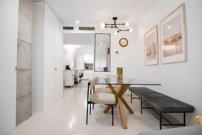 Spacious living dining room with direct access to a southeast facing terrace, perfect for enjoying the morning sun and pleasant sea views