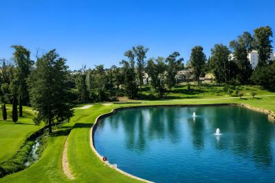 The property features a bright living-dining area with direct access to a spacious private terrace, offering open views of the communal gardens, swimming pools, and the golf course.