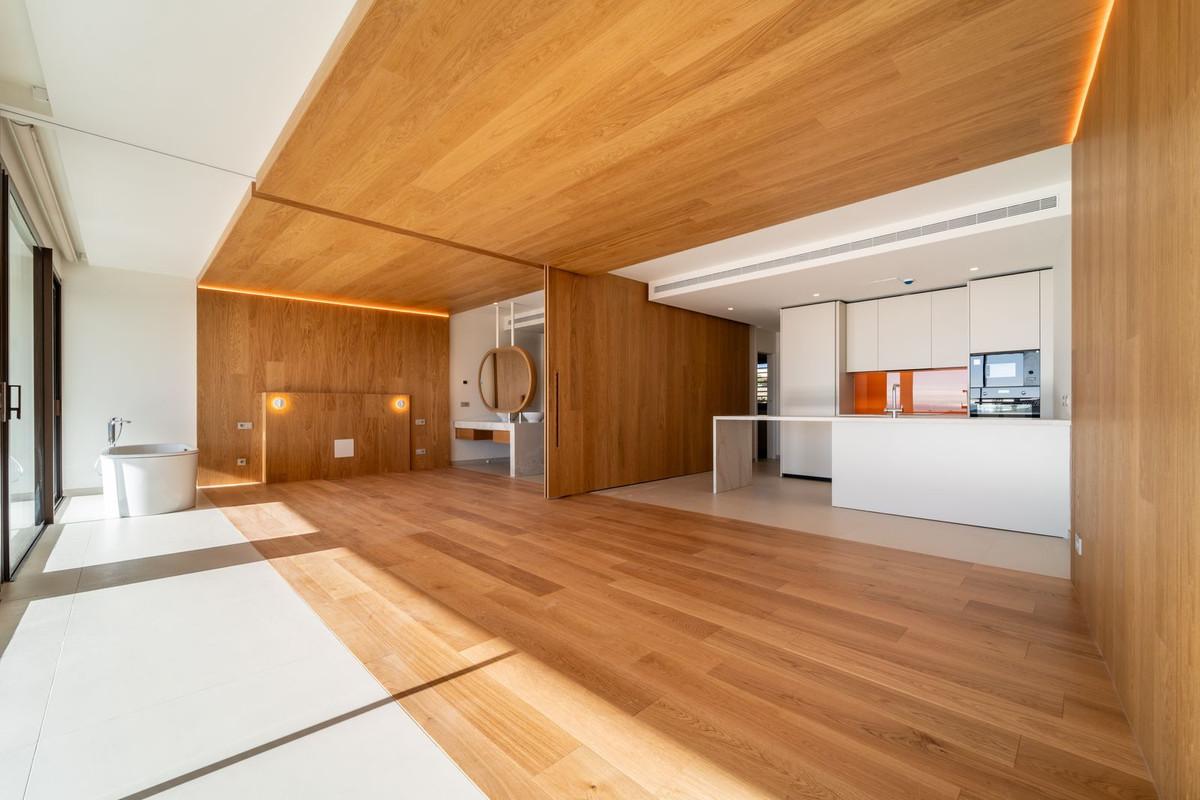 Main bedroom with ensuite bathroom and walk-in closet. This apartment is distinguished by the ingenious movable wall that connects the master bedroom-suite to the living room. This elongated sliding door is designed to duplicate the entrance of natural light and enjoying much better views. This easy interaction between the living spaces creates a flexible open area that is designed for you to enjoy the climate and lifestyle of Southern Spain. This clever design not only maximises the natural light of the Costa del Sol in both rooms, but also allows you to admire the splendid views from every corner of your home. Air conditioning hot and cold, video intercom, domotic system, pre-installation alarm system, water filter system, under floor heating in both bedrooms and bathrooms. Includes two parking spaces (one with electric car charger) and one storage room.