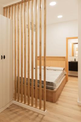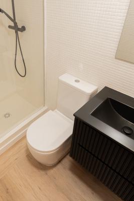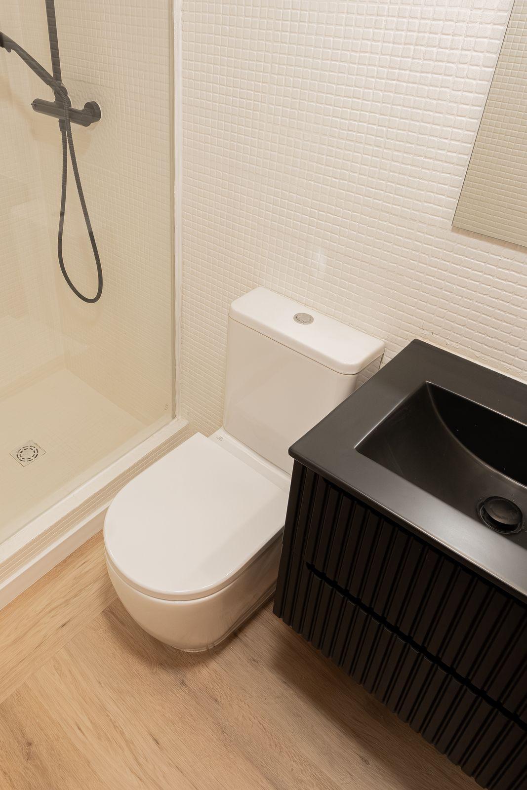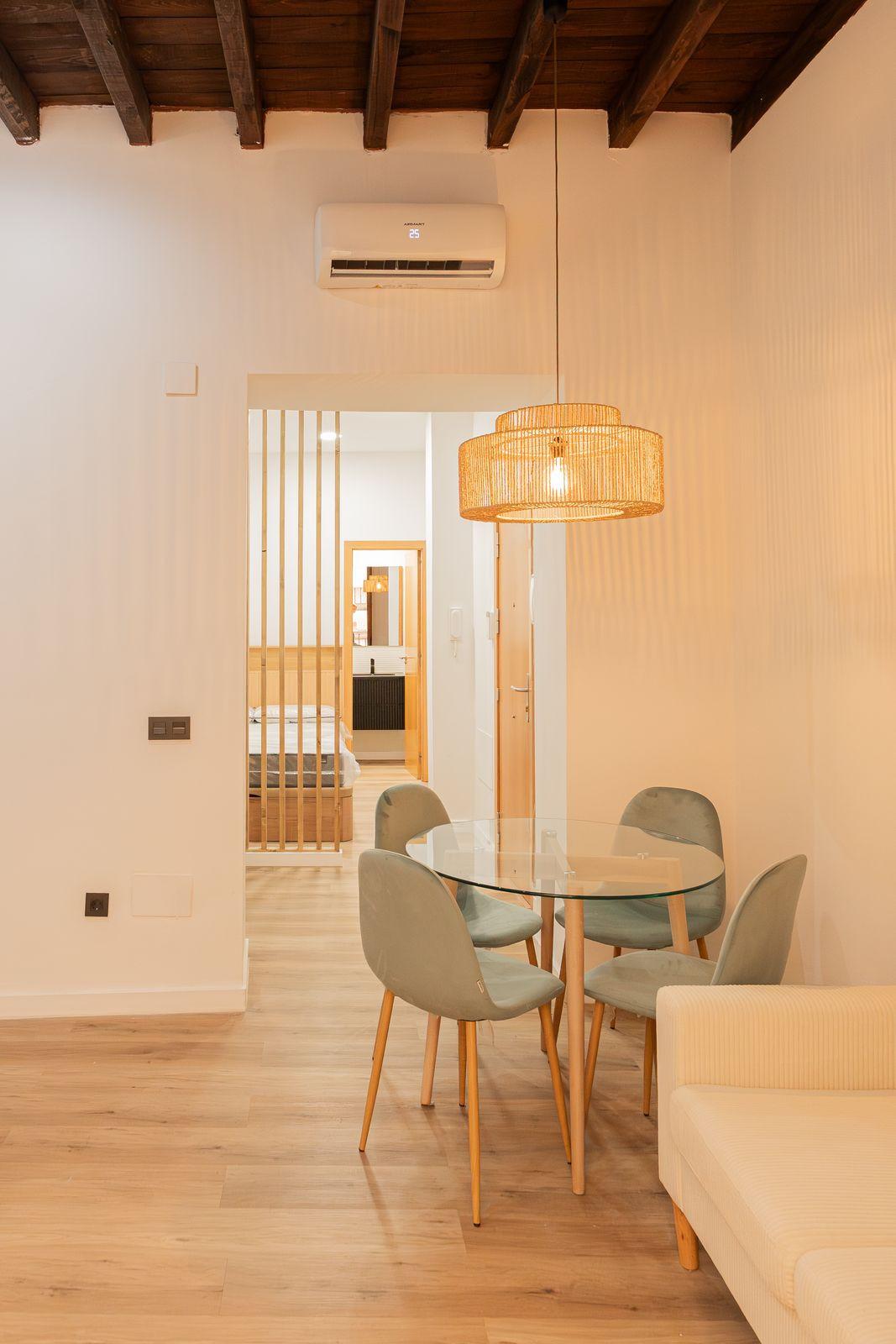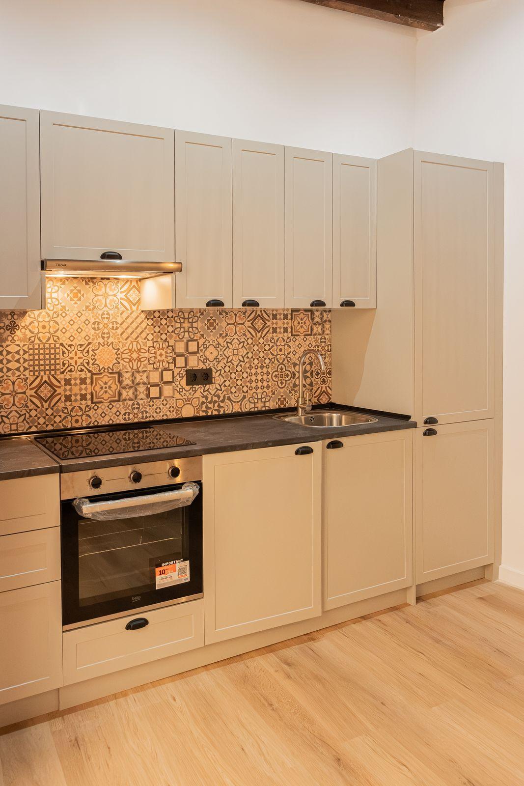 Located in a fully renovated 1880´s building, the apartment has a built area of 44 m². Originally featuring one bedroom, it has now been converted into a loft-style layout with an integrated kitchen and living area, offering plenty of natural light through its large window.