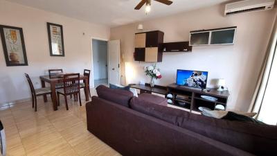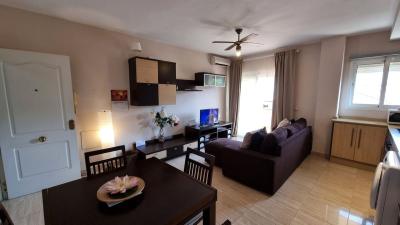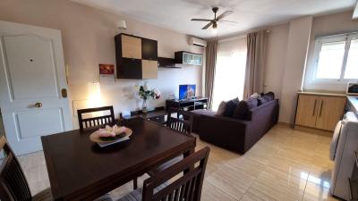 The apartment comes fully furnished and equipped, ready to move into or rent from day one. It features a communal pool, private parking space, and hot/cold air conditioning in the living-dining room and kitchen.