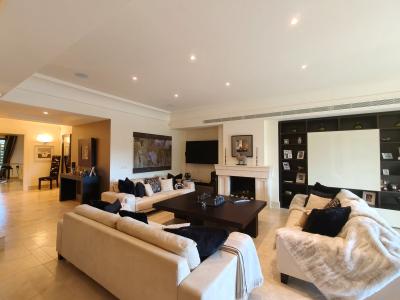 The spacious living and dining area opens through double doors onto a large south-facing covered terrace, perfect for relaxing or entertaining. The property boasts a fully equipped kitchen, a separate laundry room, a guest WC, and a storage room. Additional features include underfloor heating, air conditioning throughout, and a high-quality integrated sound system. It also benefits from a double garage space and an extra storeroom.