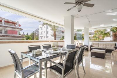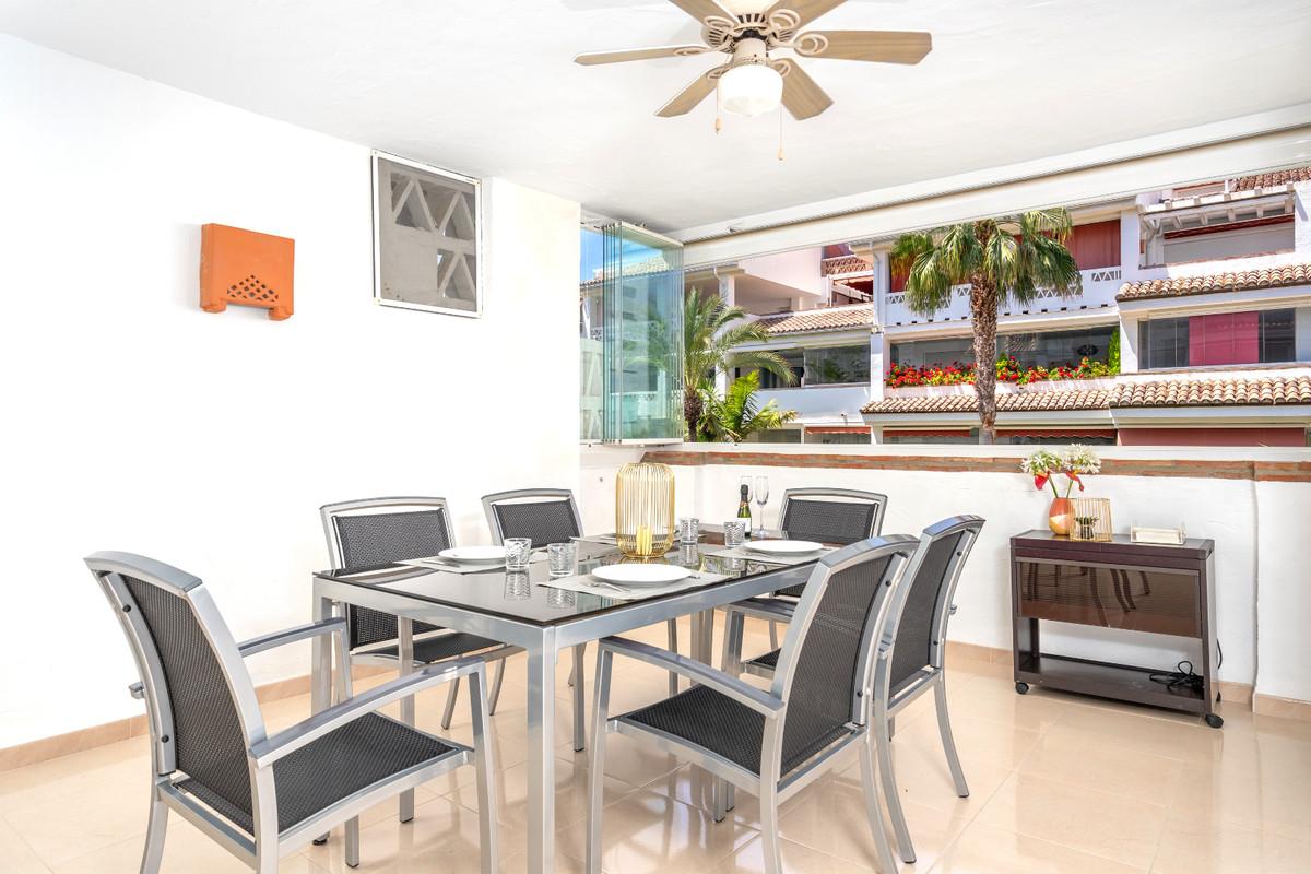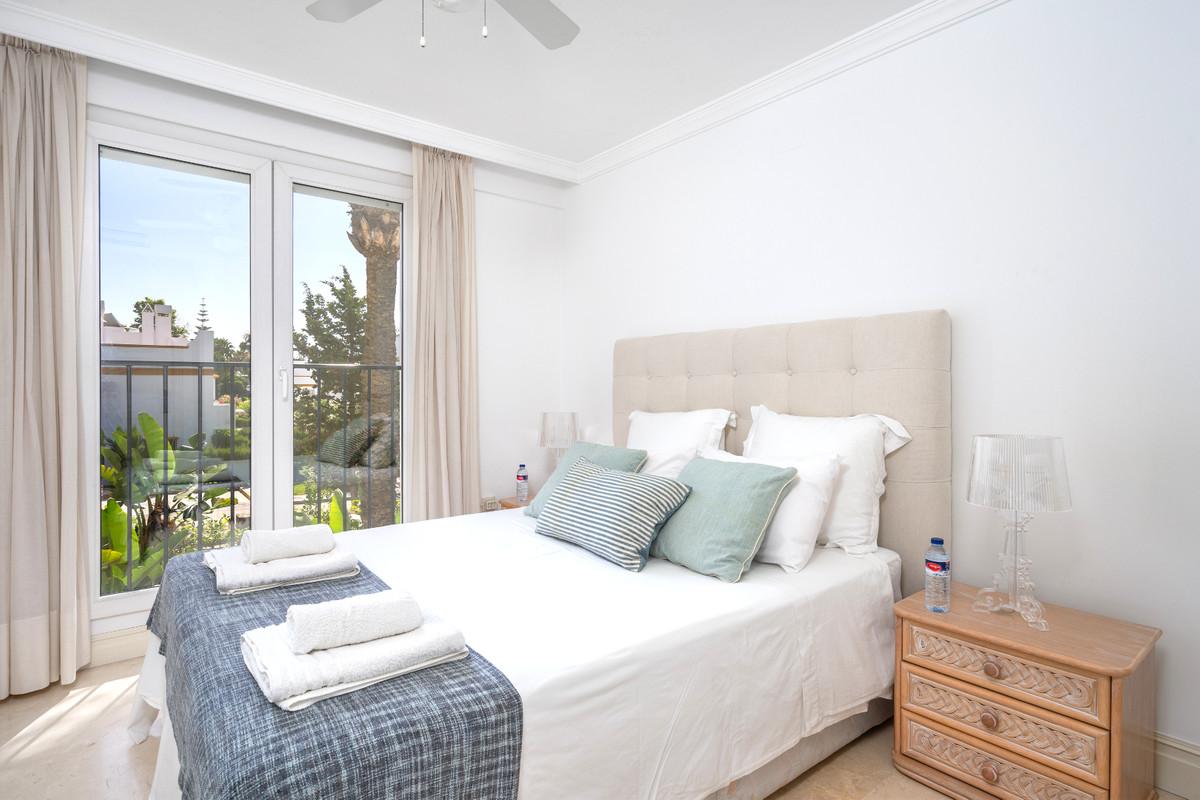 Excellent three bedroom, first floor apartment on Marbella's Golden Mile, in the sought after frontline beach community Las Cañas Beach, with 24hr security service, several communal swimming pools and tropical gardens. As well as being only a... Excellent, fully renovated, three bedroom first floor apartment on Marbella's Golden Mile, in the sought after frontline beach community Las Cañas Beach, with 24hr security service, several communal swimming pools and tropical gardens. As well as being only a short walk to many bars, shops and restaurants. Casablanca Beach, one of the best on the coast, is just outside the front door. The apartment has a spacious open plan living and dining area with French doors leading out to the private terrace which is enclosed with glass curtians; fully fitted kitchen; master suite with access to the terrace; two guest bedrooms and a guest bathroom. Other features include hot and cold air conditioning, and fitted wardrobes.