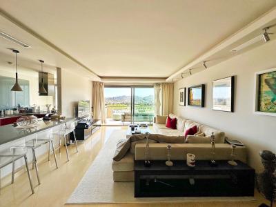 The property features a spacious living and dining area with access to a private terrace, a fully equipped modern kitchen, and two bright bedrooms. The upper level offers a large private solarium, perfect for sunbathing, relaxing, or entertaining while enjoying unbeatable sea and golf views.