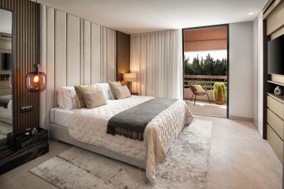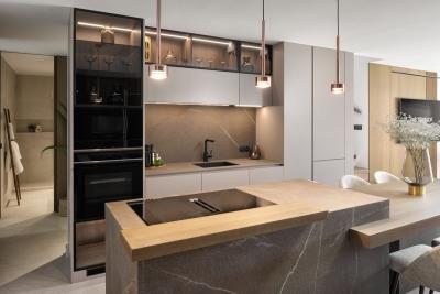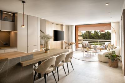 Upon entering the apartment, you are welcomed by a stunning island kitchen that sets the scene for the rest of the space as it blends harmoniously into the living area and further into the terrace, giving the impression that it is a part of the living room. Enjoy the peaceful views of the green gardens from your kitchen, where sunlight pours in to fill every square inch. The choice of materials and color palette infuses this area with a sense of peace, comfort, and subtle elegance.