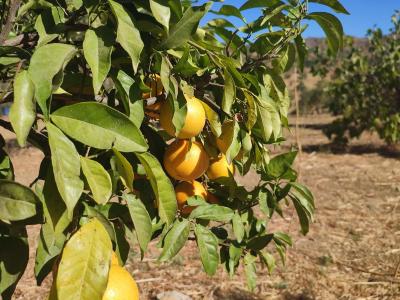 Crops: 110 olive trees, 12 avocado trees, 30 pomegranate trees, and more