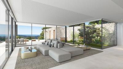 The large plot of 3.800 m2 will be home to a stunning villa with an elegant and simple aesthetic, designed with ease of use in mind, but also taking full advantage of the sea and mountain views. The villa will comprise of a lavish open-plan living space of 119m2, which leads directly to the terraces and the dramatic double-edged infinity swimming pool. On this main level will also be a utility room and storage area, as well as a beautiful courtyard garden. The lower level will house 4 en-suite bedrooms, plus an extra room which has been designed for use as an office, but which could easily be utilised as a 5th bedroom.