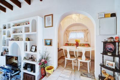 The interior features a split-level lounge with double-height ceilings and beautiful feature beams, giving the main living area a bright and open feel. An alcove provides a natural dining space, and the independent kitchen could easily be opened up to create one large open-plan area. Two bedrooms and a full bathroom sit on the ground floor with a spiral staircase leading upstairs to the master bedroom and second bathroom and access to a sunny roof terrace.