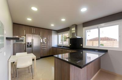 This generous villa features 4 bedrooms and 3 bathrooms, including an en suite with a jacuzzi bath. The interiors are finished with neutral décor and marble flooring throughout, fitted wardrobes, and dual-zone air conditioning for year-round comfort. The modern kitchen provides direct access to a covered terrace, ideal for al fresco dining, while the spacious living room is flooded with natural light, creating a warm and inviting atmosphere.
