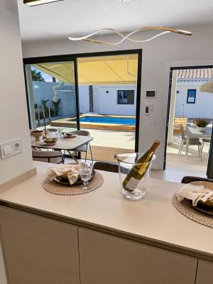 It offers 3 bedrooms, 2 bathrooms, a spacious living-dining room with TV area, and a modern fully equipped kitchen with Siemens appliances. The entire house benefits from underfloor heating, air conditioning, and state-of-the-art solar panels capable of generating enough energy to run the property without external electricity consumption.