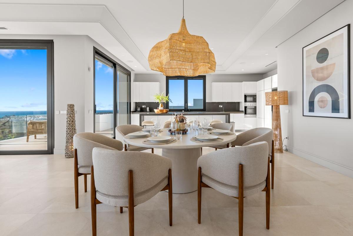 The main level is dedicated to contemporary open-plan living, framed by floor-to-ceiling windows that flood the space with natural light and seamlessly connect indoors with the surrounding landscape. Expansive sliding doors lead to a large terrace, ideal for outdoor dining for up to twelve guests while overlooking the Mediterranean. This level also includes a stylish gas fireplace, guest toilet, and a fully fitted kitchen with Silestone worktops and high-end Miele appliances, complemented by an outdoor laundry area and a charming garden.