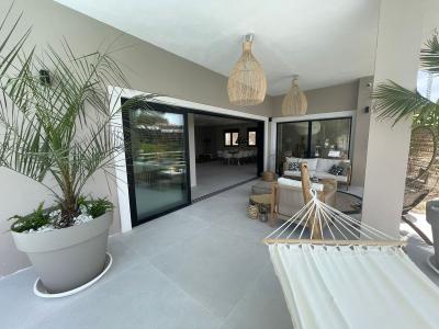 The villa is fully renovated. New piping, plumbing and wiring. All appliances are new and energy efficient. The windows have been replaced by aluminum isolated windows with electric shutters. The villa is equipped with solar panels. All bathrooms and the living room and kitchen are equipped with floor heating. The bathrooms are modern and equipped with Grohe taps. Both inside as outside the same greige large tiling is applied and the bedrooms have wooden floors.