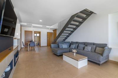 The heart of the home is a bright living-dining room, flooded with natural light through its impressive floor-to-ceiling windows framing panoramic sea views. This space flows seamlessly into the fully equipped open-plan kitchen, ready for immediate use.