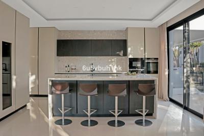 This villa has the most innovative technology. You can control lighting, music, air conditioning and security via wifi. This villa has 7 bedrooms with bathroom en-suite, a gym, music room and a tv-room in the basement, a spacious living room with large windows equipped with electric curtains. The villa bathes in natural light. High quality kitchen with custom made Terrazzo surfaces, appliances of last generation and taps by famous Swedish brand Tapwell.