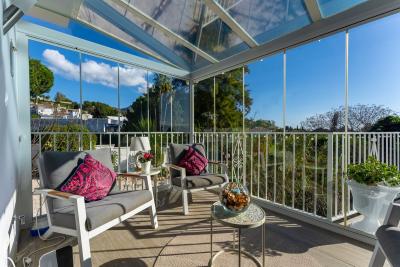 The bright and airy living room features floor-to-ceiling windows that flood the space with natural light and showcase breathtaking views. Next to it is a newly renovated, fully fitted kitchen with an island and a charming dining area, ideal for memorable gatherings. A cozy sunroom extends from the kitchen, providing a perfect spot to enjoy the stunning surroundings year-round. From here, step out onto a wrap-around terraceâperfect for relaxing while taking in the panoramic scenery.