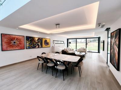 The property offers multiple terraces that capture panoramic golf views, a beautifully landscaped garden with a heated private pool, and a stylish pergola providing parking for two cars. Inside, the spacious master suite features a private lounge area, an elegant bathroom with both bath and walk-in shower, and a dressing room. Expansive floor-to-ceiling windows flood the interiors with natural light, creating a seamless connection between indoor and outdoor living spaces.