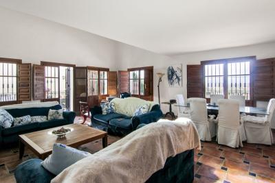 Living room is breathtaking, very spacious with high ceiling and big fireplace. Rustic style beautiful wooden framed windows, and indoor shutters, views to the countryside. A lot natural light and access to the outdoor Andalucian patio, where you can continue to the outdoor terrace. There is a potential and space to make a plunge pool. A lot of options for this idea.