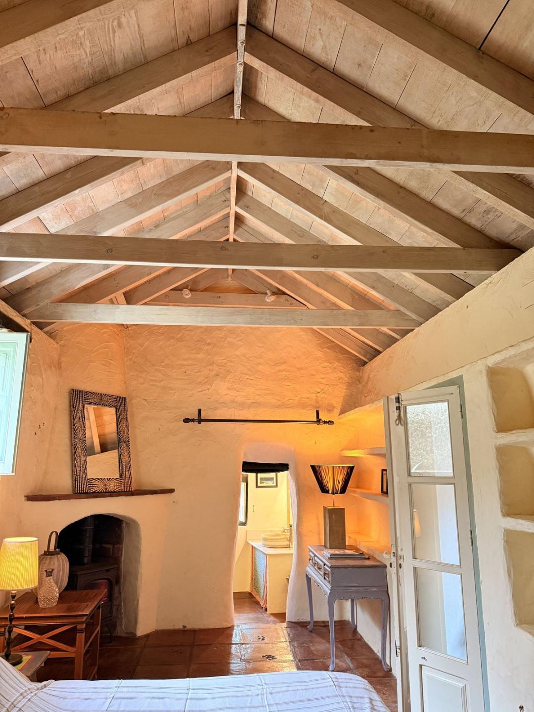 and study overlook the space , a stunning en-suite bedroom with fireplace lies to one side, and a cozy living room with wood-burning stove to the other.