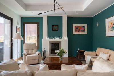 Step into a warm living room with a cozy fireplace, a bright dining area, and a spacious... Nestled in the charming heart of Benalmádena Pueblo, this elegant 285 m² semi-detached house blends comfort, space, and unforgettable views.