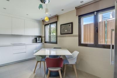 The upper level comprises four well-appointed bedrooms and four bathrooms (two of which are en-suite), delivering superb accommodation for families or guests. The master suites and guest rooms are elegantly finished, some offering direct terrace access and serene garden or street views. Outlined by a private garden, the property's outdoor spaces are perfect for unwinding or entertaining in the Mediterranean climate. The carport provides secure parking within the gated community, further contributing to peace of mind.